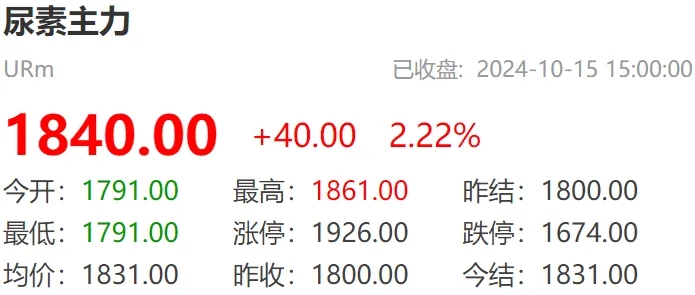 2024年10月15日郑商所尿素主力合约UR2501:开盘1791元/吨,收盘1840元/吨,结算1831元/吨,较上一交易日涨40元/吨。