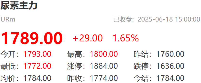 2025年6月18日郑商所尿素主力合约UR2509:开盘1793元/吨,收盘1789元/吨,结算1784元/吨,较上一交易日涨29元/吨。