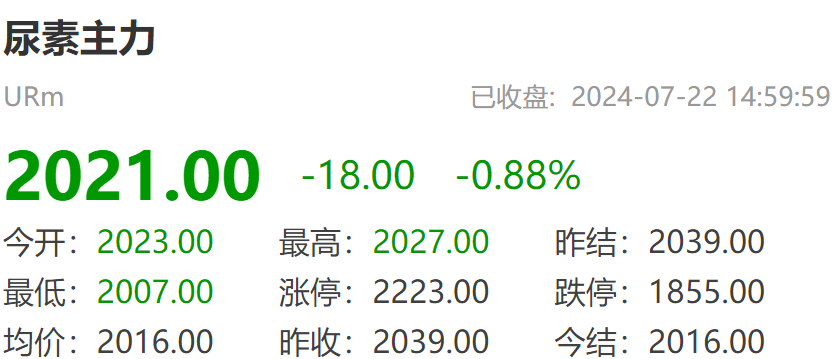2024年7月22日郑商所尿素主力合约UR2409:开盘2023元/吨,收盘2021元/吨,结算2016元/吨,较上一交易日跌18元/吨。