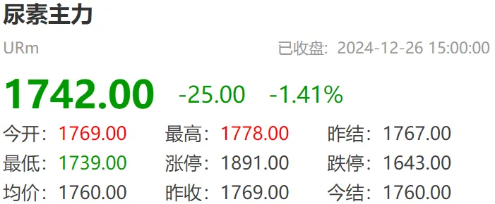 2024年12月26日郑商所尿素主力合约UR2505:开盘1769元/吨,收盘1742元/吨,结算1760元/吨,较上一交易日跌25元/吨。